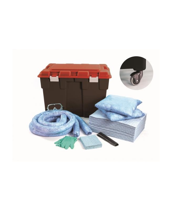 Kit d'intervention pour hydrocarbures, capacité d'absorption 100 litres. Contenant : coffre PE vert mobile (roulettes à poser par l'utilisateur) avec couvercle amovible (842 x 602 x 660 mm). Contenu : 50 feuilles double épaisseur 40 x 50 cm, 2 boudins 8 cm x 3 m, 2 coussins 40 x 40 cm, 15 feuilles d'essuyage, 1 paire de gants nitrile, 1 paire de lunettes, 2 sacs de récupération 100 litres.