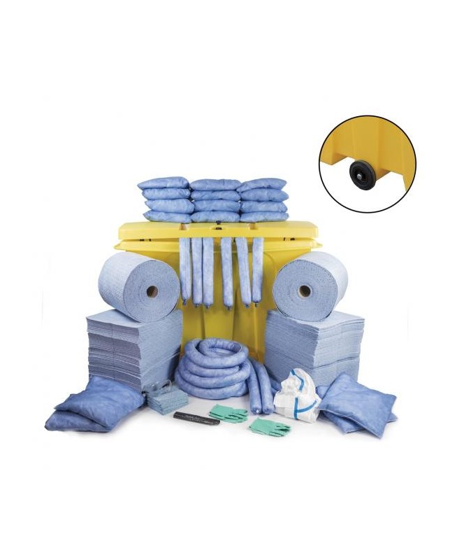 Kit d'intervention pour hydrocarbures, capacité d'absorption 800 litres. Contenant : Coffre PE jaune avec couvercle, serrure et 3 roulettes (1460 x 1010 x 975 mm). Contenu : 300 feuilles double épaisseur 40 x 50 cm, 2 rouleaux double épaisseur 40 cm x 40 m, 10 boudins 8 cm x 3 m, 20 coussins 40 x 40 cm, 50 feuilles d'essuyage, 2 paire de gants nitrile, 1 paire de lunettes, 1 combinaison, 16 sacs de récupération 100 litres.