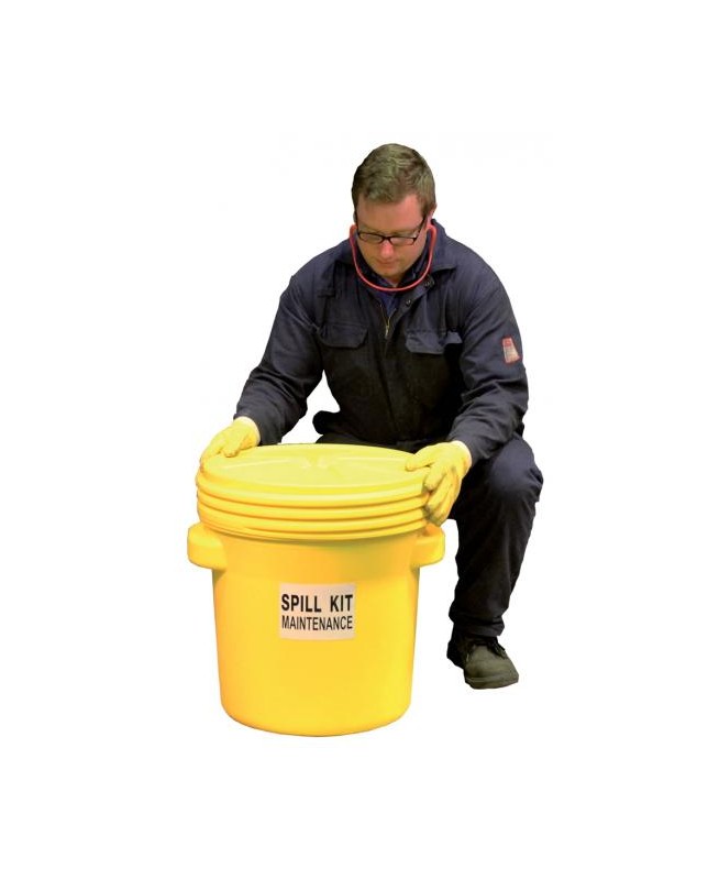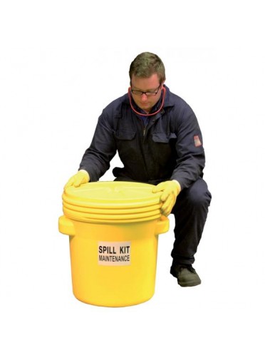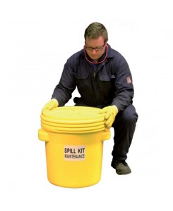 Kit d'intervention pour tous liquides, capacité d'absorption 60 litres. Contenant : Surfût jaune 77 L avec couvercle étanche, 520 x H527 mm. Contenu : 40 feuilles double épaisseur 40 x 50 cm , 5 boudins Ø 8 x 1,2 m , 10 feuilles d’essuyage 32 x 40 cm , 1 paire de gants , 2 sacs de récupération 50 L , 1 paire de lunettes.