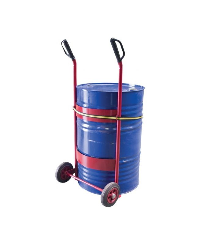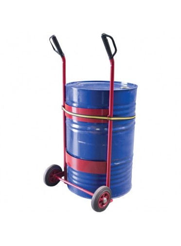 Diable pour fûts métalliques et plastiques de 50 à 220 litres, équipé d'une sangle - charge utile 250 kg - Roues 200 mm - peint RAL 3002. Dimensions : 650 x 290 x H280 mm. Poids : 12 kg.