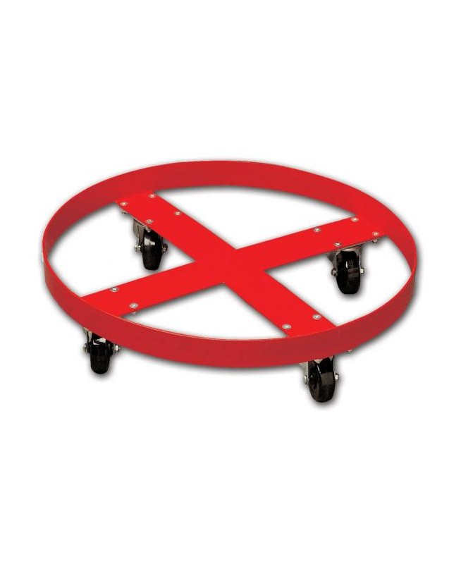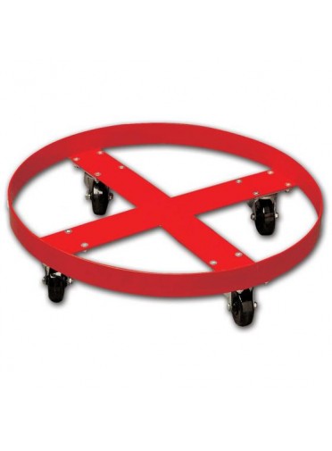 Rouleur pour fûts métallique ou plastique de 60 à 220 litres avec 4 roulettes pivotantes, charge utile 410 kg. Dimensions : diamètre 603 x hauteur 153 mm, poids : 5 kg, couleur rouge.