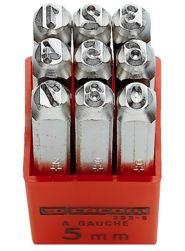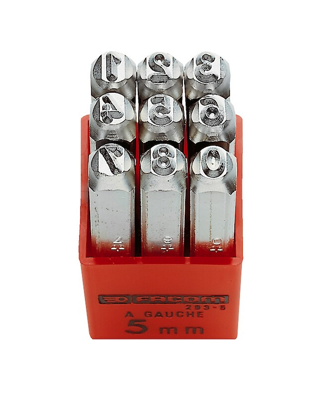 JEU CHIFFRESJeu de 9 chiffres à frapper A 5 mm L 75 mm - dimensions en mm 40 x 40 x 80 - section des marquages en mm 10 x 10 - hauteur des chiffres : 2 à 8 mm - acier carbone 60 HRc - Facom 293A.5 - UC : MULTIPLE DE : 1