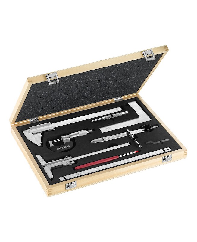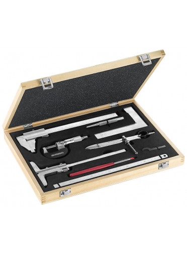 COFFRET METROLOGIE 8 OUTILSCoffret métrologie - contrôle 8 outils - pied à coulisse 1/50 de mm - réglet inoxydable de 300 mm - jauge de profondeur 1/50 de mm - équerre simple de 150 mm - pointe à tracer - pointeau - micromètre - compas droit - Facom 809.J2 MULTIPLE DE : 1