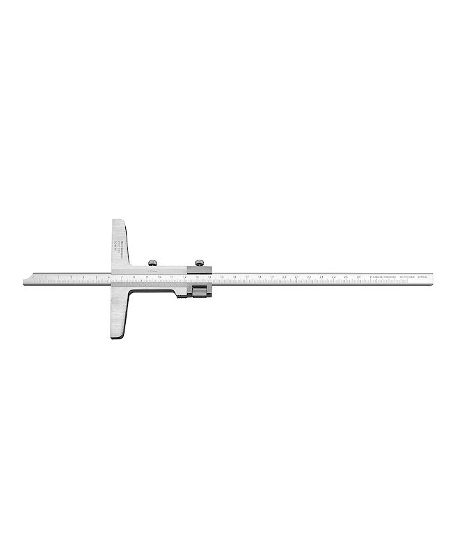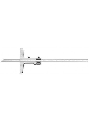 JAUGE PROFONDEUR 1/50EME 250MMJauge de profondeur 200 mm classe 0 - précision 1/50ème - réglet acier inox - dureté de la règle 40 HRc minimum - dureté de la surface de mesure 53 HRc minimum - blocage du vernier par vis de réglage de précision - Facom 811C.250 MULTIPLE DE : 1