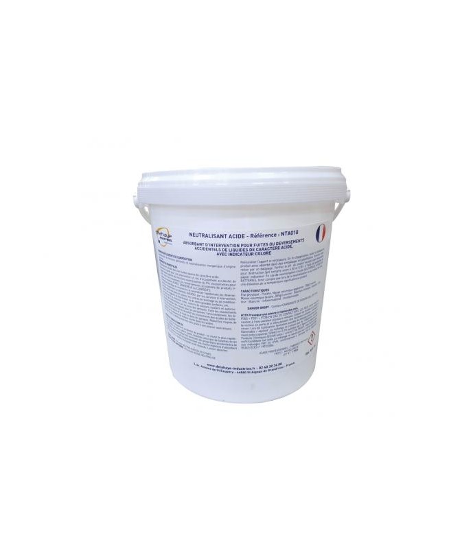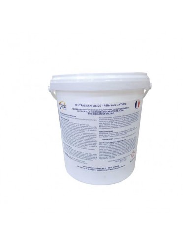 Neutralisant chimique pour les Acides. Agit par gélification et changement de couleur pour signifier la neutralisation du PH. Seau de 5 L, poudre de couleur blanche.
