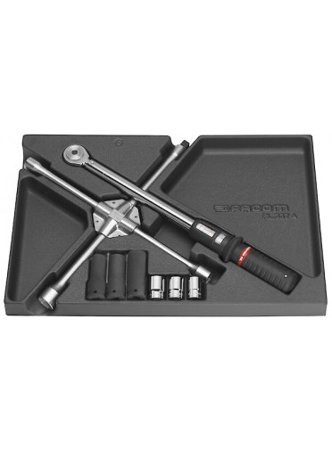 "MODULE ROUES Module serrage écrou de roues 9 pièces comprenant - Clé en croix - Clé dynamométrique 40 - 200 N.m - Douilles impact longues 1/2"" de 17 - 19 - 21 mm - Douilles 6 pans 1/2"" de 17 - 19 - 21 mm - FACOM MOD.208 MULTIPLE DE : 1"