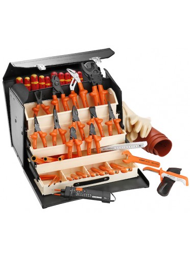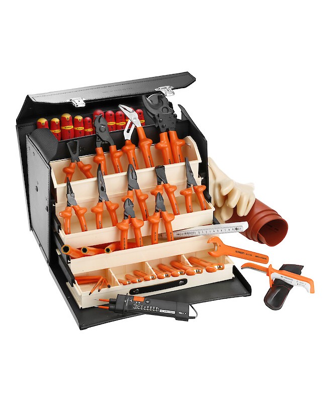 SELECTION DE 42 OUTILS ISOLESSélection outillage électricien isolés 1000 volts 41 pièces, isolation avec code couleur de sécurité + valise en cuir tiroirs coulissants + bac amovibles BV.5 - FACOM 2184C.VSE - UC : MULTIPLE DE : 1