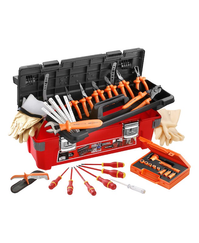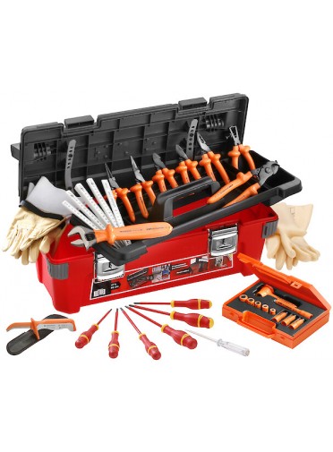 SELECTION DE 28 OUTILS ISOLESSélection outillage électricien, outils isolés 1000 volts 19 pièces. Isolation avec code couleur de sécurité + boîte plastique BP.P26 - FACOM 2185C.VSE - UC : MULTIPLE DE : 1