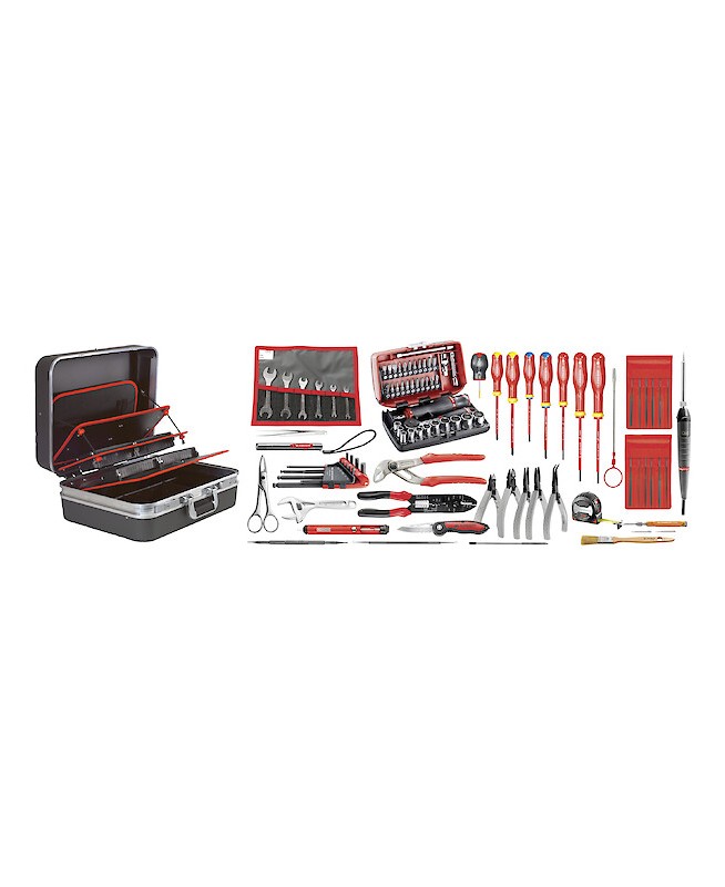 COMPOSITIONSélection outillage électricien 94 pièces - Outils isolés 1000 volts isolation avec code couleur de sécurité - Livrée avec valise coque antichocs, verrouillage par clé BV.51A - FACOM 2208.EL32 - UC : MULTIPLE DE : 1