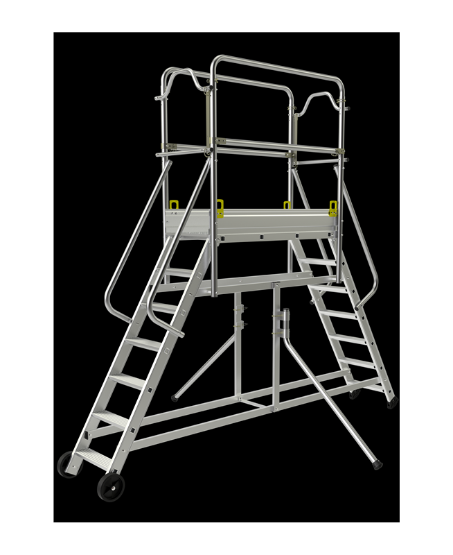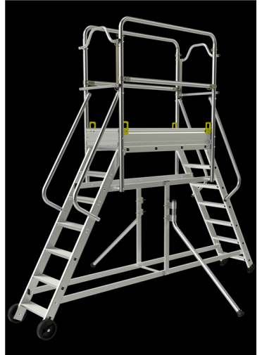 Plateforme 1,22 x 0,43 m, garde corps, lisses, sous lisses et stabilisateurs escamotables.