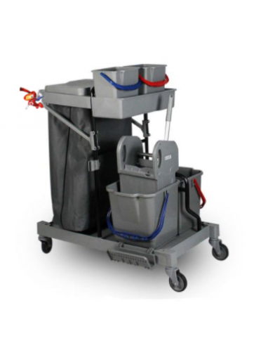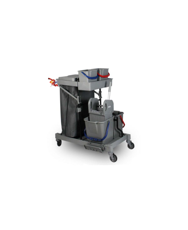 Le chariot de ménage est équipé d'une presse à mâchoire qui convient pour tous les types de franges (Faubert, MOP, système de lavage à plat...). Ces 2 grands seaux gris avec anses colorées vous permettent de séparer facilement votre solution de lavage de votre eau de rinçage. Les 2 seaux de 6 L servent en contenir vos produits nettoyants ou ustensiles. Fabriqué en Polypropylène haute densité, il est adapté à un usage professionnel intensif. Polyvalent, il vous permet de Laver, dépoussiérer et collecter (des déchets ou du linge) en toute simplicité. Très maniable grâce à ses 4 roues vous emporterez facilement vos produits de nettoyage grâce au bac à produit. Le support de sac avec couvercle et sac de protection de 120 L peut être facilement transformé en 2 sacs de 60L en enlevant une barre de séparation.