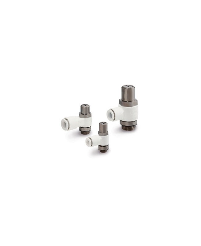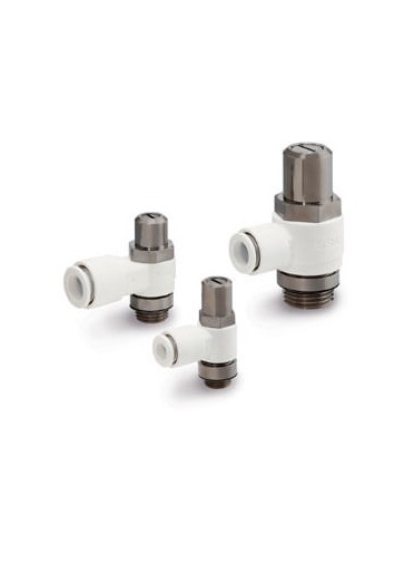 L'utilisation des regleurs de debit de SMC avec raccords integres reduit les temps d'installatione la hauteur de montage et permet de concevoir des machines plus compactes Le corps de ces regleurs de debit peut pivoter ce qui facilite l'installation Disponible avec des taraudages allant de M3 … 1/2 en pouces (NPT) et en mm R(PT)e avec des diamŠtres exterieurs de tube allant de 3 2 … 12 mm (mm) et de 1/8 … 1/2 (en pouces)e en version equerre ou droite (flexibilite accrue) et reglage … l'admission ou … l'echappemente ces regleurs de debit ont ete con‡us pour s'adapter … la plupart des applications