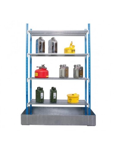 Rayonnage léger avec rétention au sol. 1 travée de base, dimensions : 1290 x 600 x H2000 mm. 4 poteaux, 4 étagères réglables en hauteur avec tôle perforée galvanisée.1 bac de rétention 216 litres au sol, acier galvanisé, dimensions : 1450 x 760 x H210 mm.