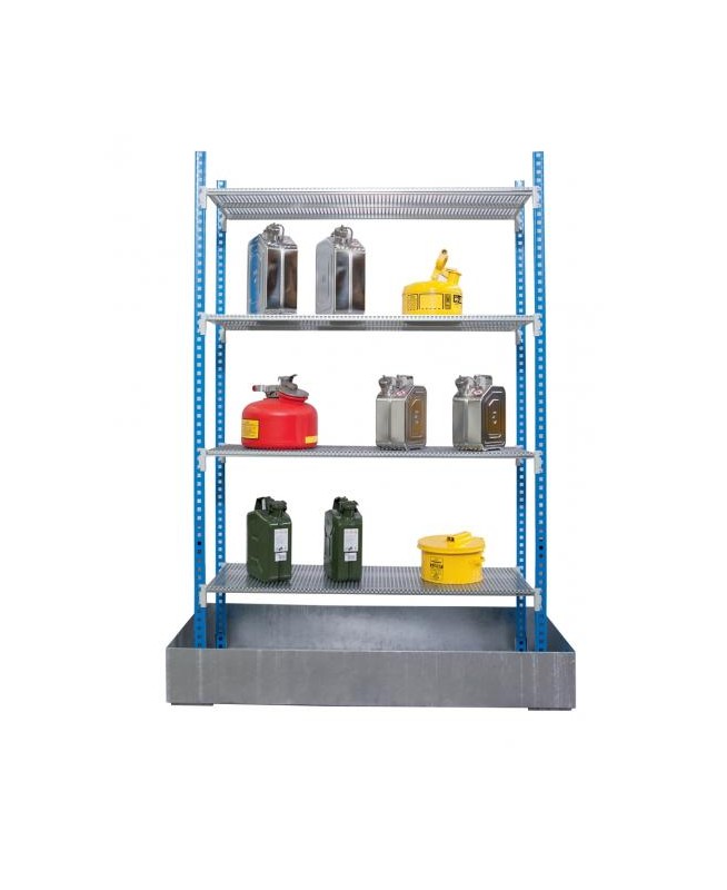 Rayonnage léger avec rétention au sol. 2 travées, dimensions : 2060 x 400 x H2000 mm. 6 poteaux, 8 (2 x 4) étagères réglables en hauteur avec tôle perforée galvanisée.1 bac de rétention 241 litres au sol, acier galvanisé, dimensions : 2200 x 560 x H210 mm.
