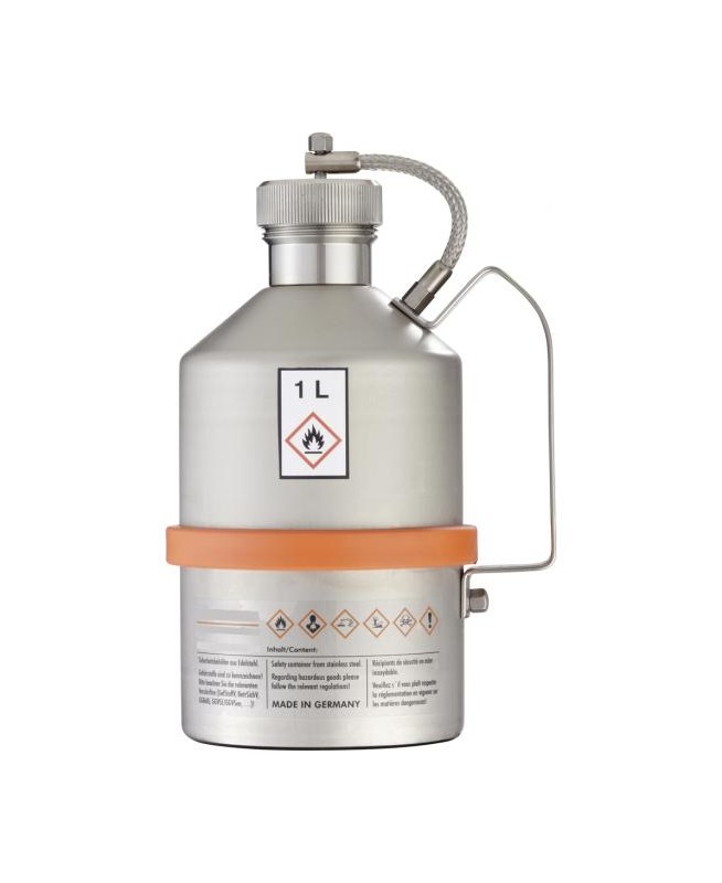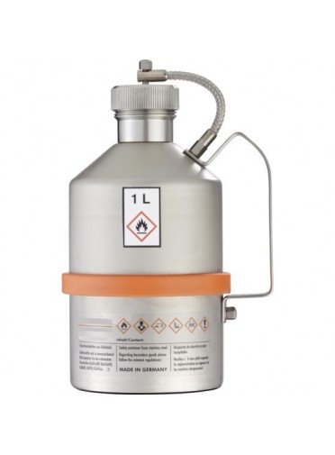 Bidon de Sécurité avec bouchon fileté de 2 L pr liquides inflammables ou explosifs. Utilisation pr le transport et le stockage, homologué ADR. Acier inoxydable non poli, joint Téflon, pare-flamme dans le col. Dim. : H270 x Ø130 mm, poids : 1 kg.