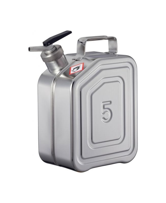 Jerrican de 5 L avec bec verseur pr liquides inflammables ou explosifs. Pr stockage et distribution sur place. Acier inoxydable non poli, joint Téflon, pare-flamme dans le col, compensateur de pression. Bec verseur à débit réduit autofermant. Dim. : H280 x L130 x Lo210 mm, poids : 2 kg