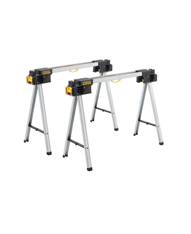 Structure et pieds en métal - Très haute capacité de charge jusqu'à 900 kg/paire - Pieds rabattables et tréteaux clipsables entre eux - Rainure en V pour pièces arrondies) + 1 large rainure (pour planches, chevrons…) pour immobilisation pièces - Poignée de transport rabattable