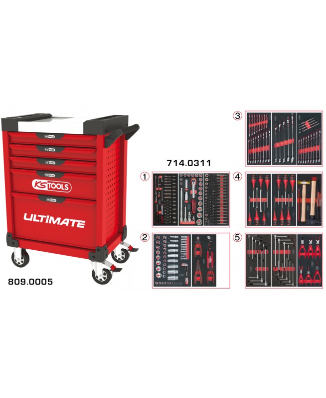 Servante ULTIMATE rouge 5 tiroirs équipée de 311 outils