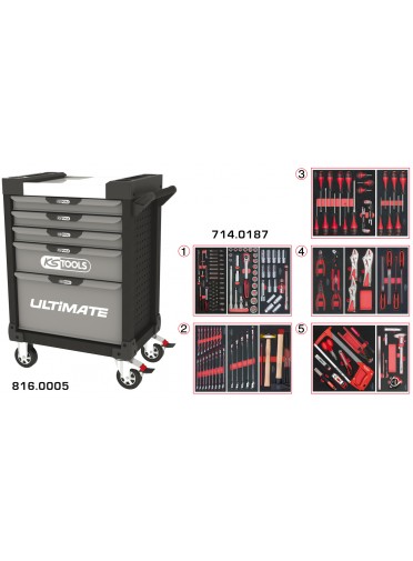 Servante ULTIMATE grise et noire 5 tiroirs équipée de 187 outils