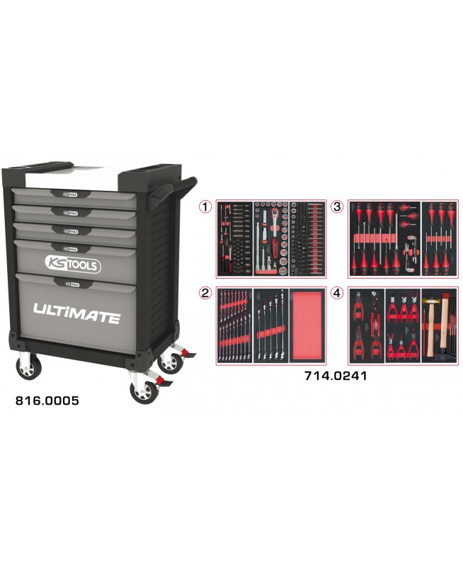 Servante ULTIMATE grise et noire 5 tiroirs équipée de 241 outils