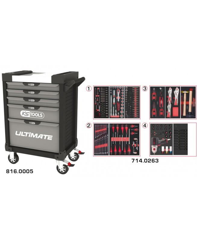 Servante ULTIMATE grise et noire 5 tiroirs équipée de 263 outils
