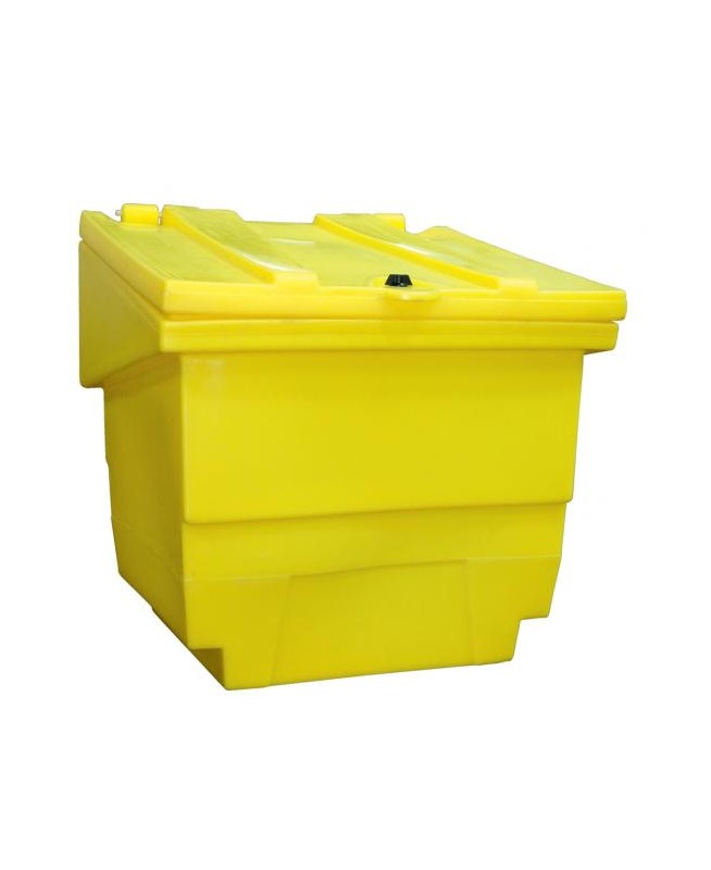 Coffre à absorbant jaune, capacité 250 litres, avec couvercle. 100 % polyéthylène. Manutentionnable grâce au passage de fourches. Etanche avec couvercle verrouillable à clé. Dim. Lo x La x H : 875 x 875 x 870 mm