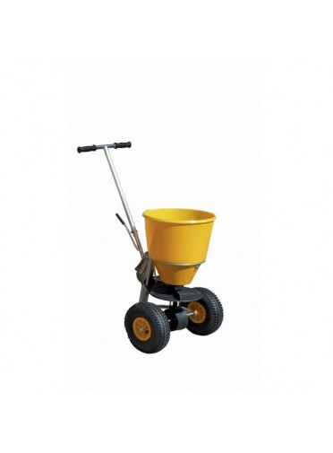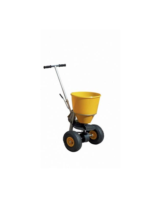 Epandeur contenance 20 litres / 25 kg. Largeur d'épandage : de mi-cercle 1 à 3 m. Cadre en acier inoxydable et trémie en PE jaune. 2 roues gonflables avec profil neige. Manette de réglage du débit. Guidon de avec tige de direction et béquille escamotable. Poids : 9 kg