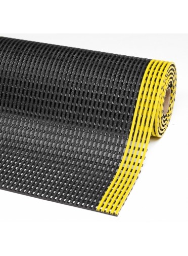 Tapis anti-fatigue pour grande longueur, milieux industriels secs ou humides, avec perforations, résistant aux hydrocarbures et nombreux produits chimique, épaisseur 12 mm, dimensions 600 x 10 000 mm, poids 40,5 kg, coloris noir et jaune.