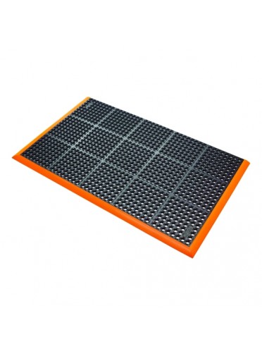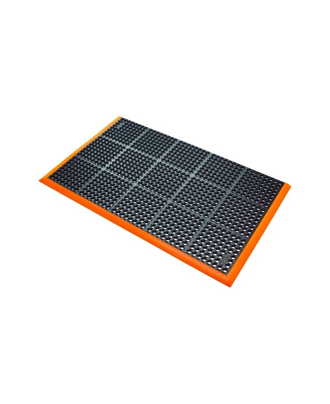 Tapis anti-fatigue pour milieu secs et huileux. Fabrication en Nitrile, résistant aux hydrocarbures, avec perforations pour drainage des liquides, bordure orange sur 3 cotés, épaisseur 22 mm, dimensions 970 x 3150 mm, poids 37,2 kg, coloris noir et orange.
