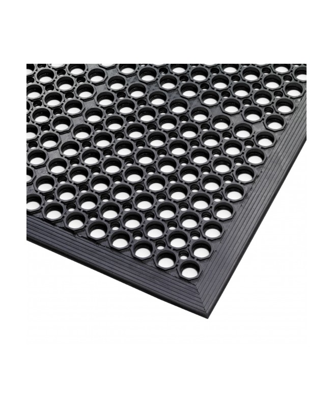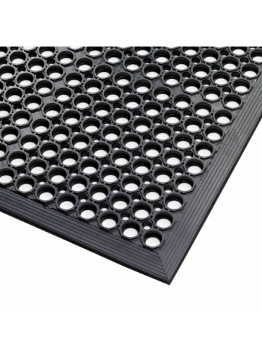 Tapis anti-fatigue pour milieu industriels secs ou humides. Fabrication en caoutchouc naturel, avec perforations pour drainage des liquides, bordure intégrée sur 4 cotés, épaisseur 12,7 mm, dimensions 910 x 1520 mm, poids 11 kg, coloris noir.