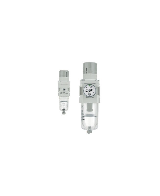 Cette combinaison filtre/regulateur minimise l'encombrement et les raccordement en integrant deux unites en une Les caracteristiques standards incluent un regulateur de la purge qui peut ˆtre verrouille rapidement en abaissant la manette de reglage Elle offre de nombreuses optionse entre autres : des manomŠtrese la purge automatiquee une cuve en metale differentes pression de reglagee etc Le AW-A appartient … la famille des unites de traitement de l'air modulaires et peut ˆtre combine avec des produits de taille similaire Cette serie est disponible dans 3 tailles de corps et avec des raccords allant de 1/8 … 3/4 en pouces (NPT) et en mm Rc (PT)